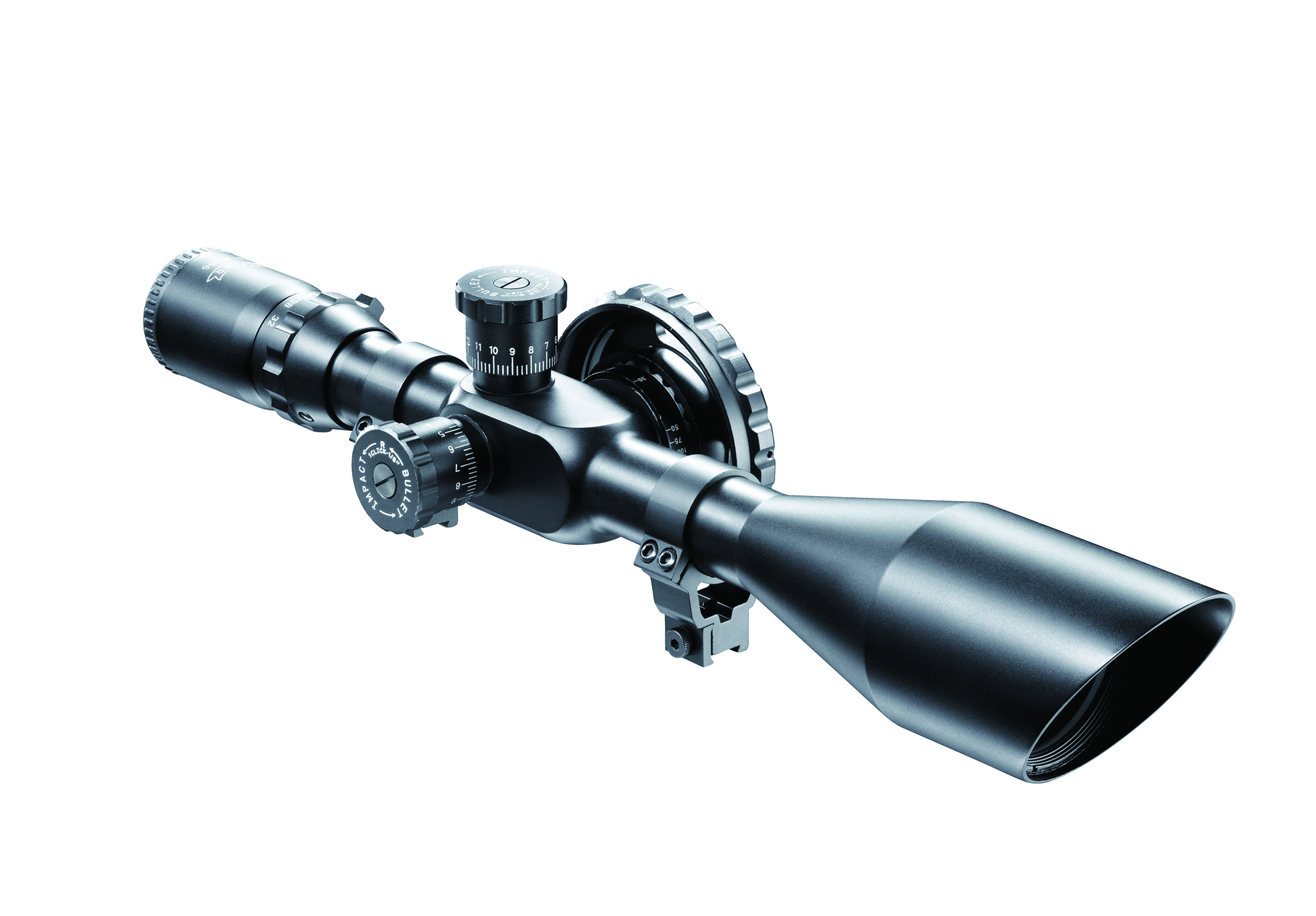 Parallax adjustment with large side wheel, target turrets offering a large range for graduated adjustment (windage and elevation), angled objective for reflection-free aiming