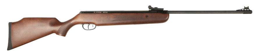The Crosman Vantage spring powered air rifle boasts a dark beech wood stock and foregrip, rifled-steel barrel and lever safety offer a traditional feel. The Vantage features an adjustable two-stage trigger, fiber optic sights and Dovetail mounting rail.