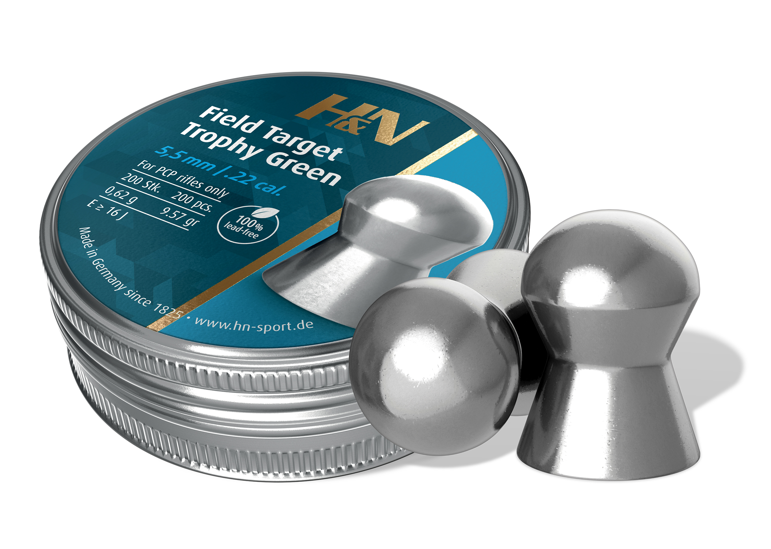 H&N Field Target Trophy Green in .22 is a lightweight, lead-free, and aerodynamic pellet for high velocity, flat trajectory, and hard impact.