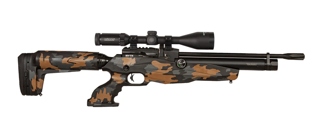 The Reximex Myth is a new compact air rifle that features an air bottle to the rear and an air cylinder to the front. Due to this, the rifle is capable of approximately 210 shots per fill at 200 bar. Featuring a Soft touch synthetic stock with a pistol grip. The Myth has a cocking lever which is located on the right side of the action. You will find the manual safety to the rear of the stock which can be easily switched between on and off. The rifle also has a fully adjustable 2 stage trigger.