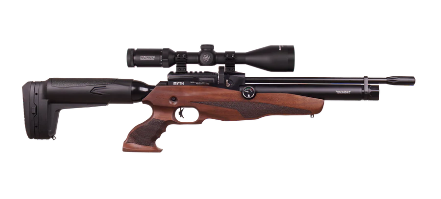 The Reximex Myth is a new compact air rifle that features an air bottle to the rear and an air cylinder to the front. Due to this, the rifle is capable of approximately 210 shots per fill at 200 bar. Featuring a Soft touch synthetic stock with a pistol grip. The Myth has a cocking lever which is located on the right side of the action. You will find the manual safety to the rear of the stock which can be easily switched between on and off. The rifle also has a fully adjustable 2 stage trigger.
