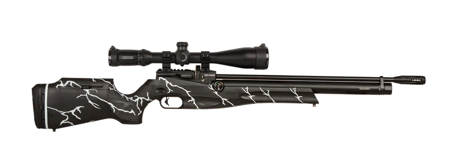 The Reximex Pretensis is a full length sporter rifle with a 260cc air cylinder. Due to the 260cc air cylinder the rifle is capable of 210 shots at 200bar. The Pretensis features a soft touch stock with adjustable cheek piece, butt pad & pre-fitted swivel screws.The Pretensis has a cocking lever which is located on the right side of the action. You will find the manual safety to the rear of the stock which can be easily switched between on and off. The rifle also has a fully adjustable 2 stage trigger.