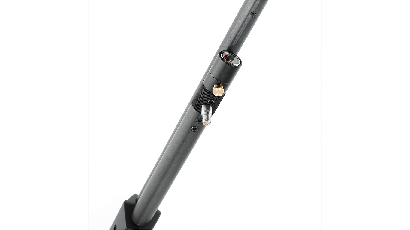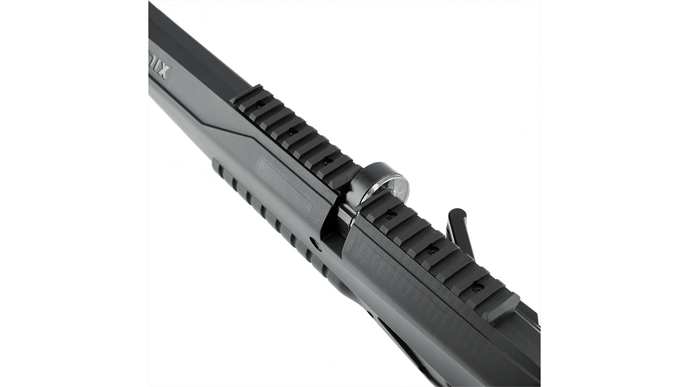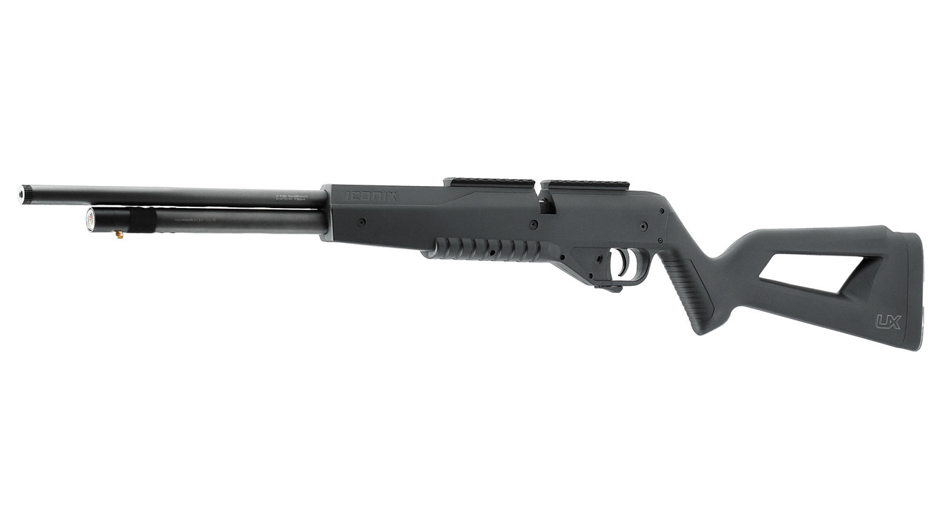 The UX Iconix features a rifled barrel with a length of 510 mm, an integrated pressurized steel cylinder with a volume of 100 cubic centimeters, a pressure gauge and a filling adapter. The operating pressure is 207 bar / 3000 psi. The rotary magazine and ergonomic cocking lever permit rapid firing of 10 4.5 mm (.177) pellets. A single shot tray is included as well, which allows the indiviual feeding of each pellet. The barrel features a muzzle thread with 1/2″-20 UNF.